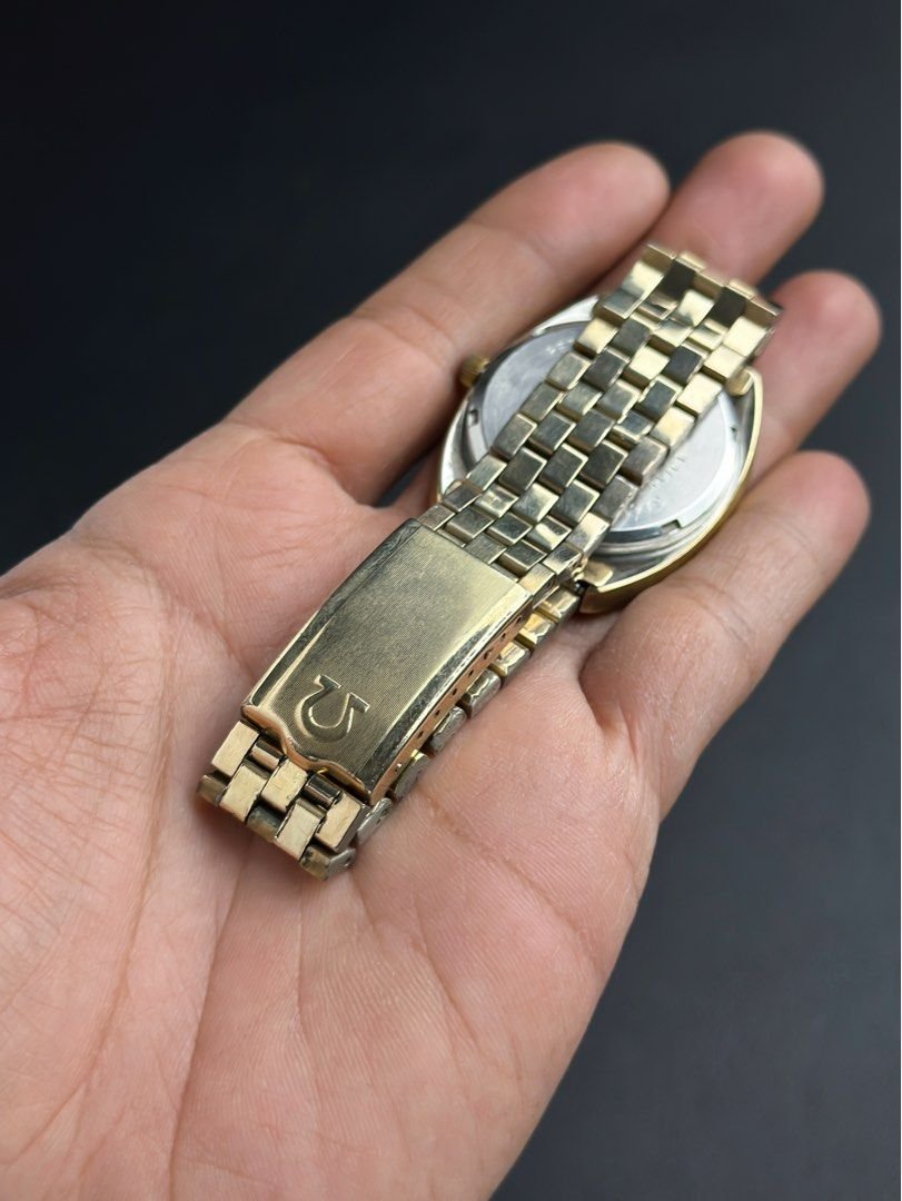 Featuring a stunning gold top case that exudes a warm and refined glow, the Omega Constellation 168.005 was engineered to leave a lasting impression. Complemented by its iconic ‘pie-pan’ dial, this particular model is instantly recognizable among watch enthusiasts. Its bold, angular hour markers paired with sleek dauphine hands enhance readability while adding a touch of sophistication.